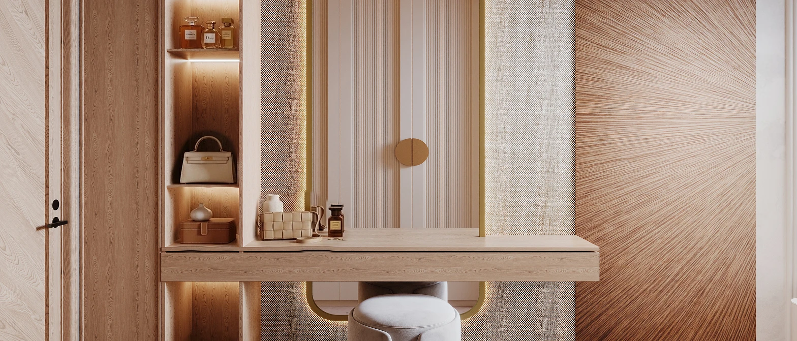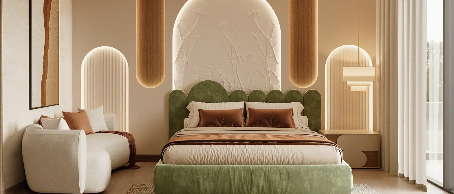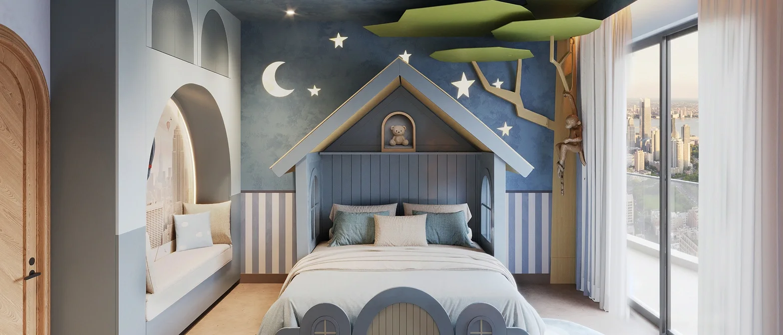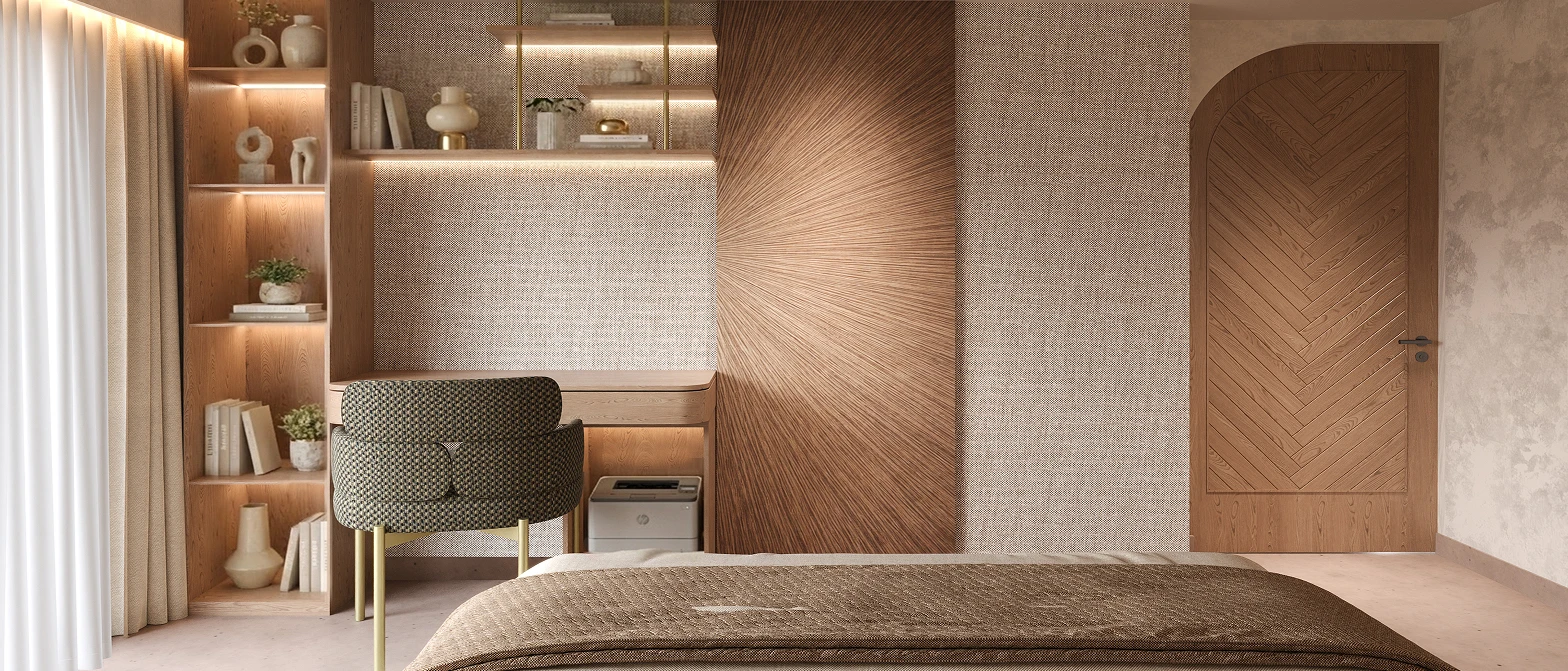 The private quarters continue the narrative of "Bespoke Curation." The master suite showcases sunburst-patterned wood joinery and integrated lighting, while the guest bedroom utilizes olive green velvets and arched niches to create a restful environment. From the smart, marble-clad kitchen to the playful, sky-themed children’s room, every corner reflects a commitment to high-end craftsmanship and mindful living.