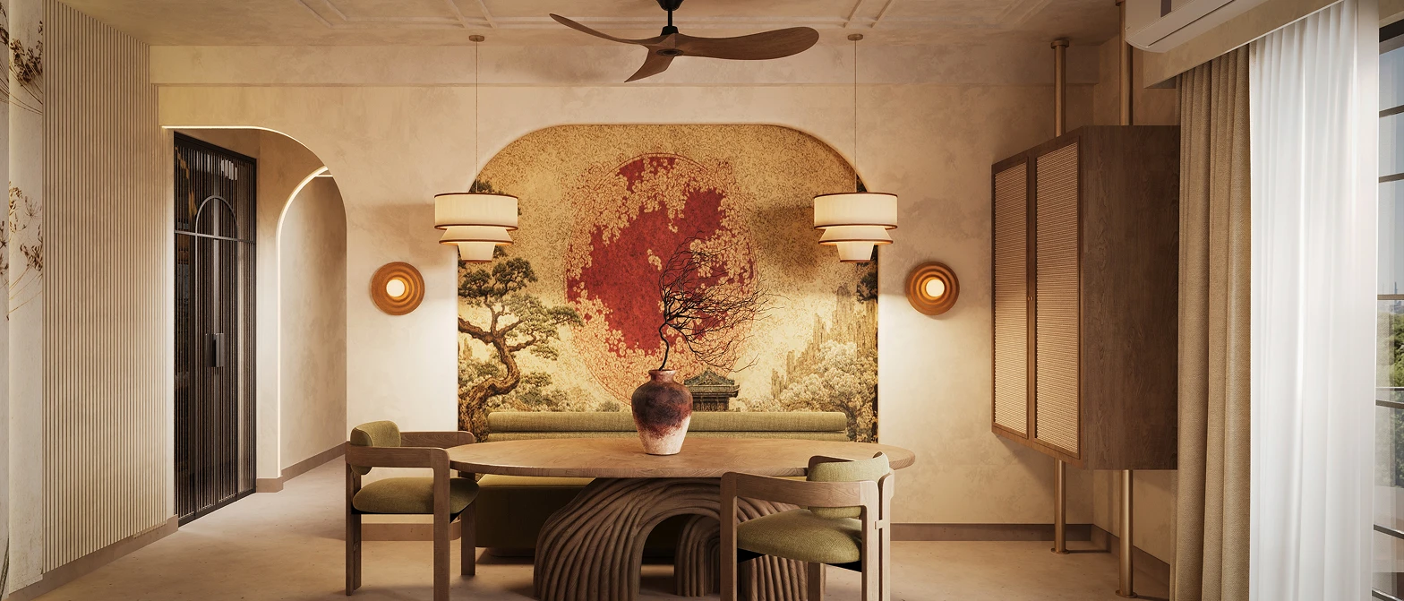The living area serves as the heart of the home, featuring bespoke fluted wall panels, soft-curved furniture, and a sculptural TV unit that acts as a subtle room divider. In the dining space, a striking hand-painted mural provides a focal point, harmonizing with the natural wood finishes and architectural arches that define the hallway.